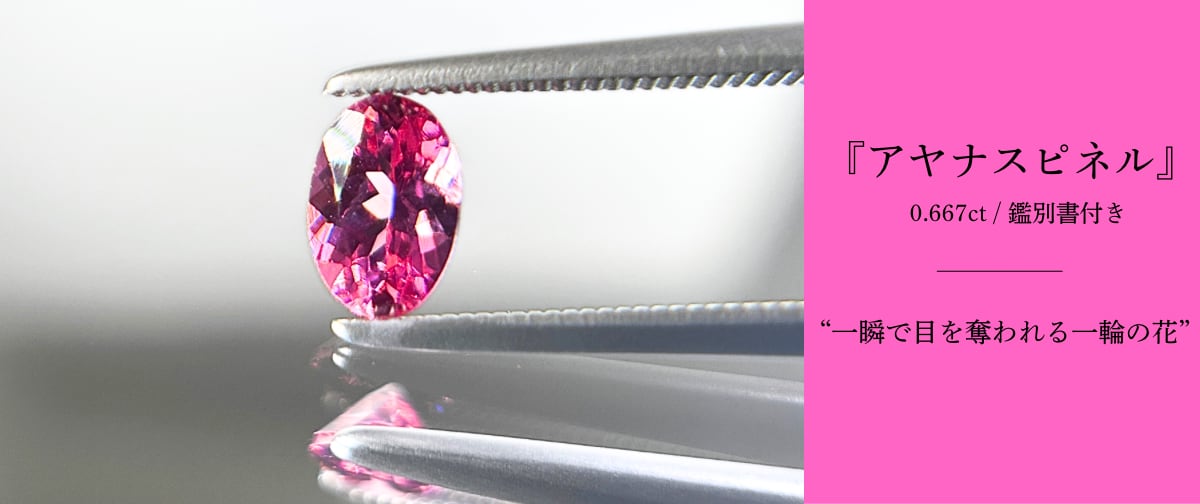 ▶︎▷詳細 - 重量: 0.667ct - サイズ: 縦6.54㎜ / 横4.53㎜ / 高3.23㎜ - 形: オーバル - 硬度: 8.0 - エンハンスメント: 無処理 - 鑑別書付き(中央宝石研究所) ▷T.Jewel's メモ 現地の言葉で『美しい花』という意味を持つ"アヤナ"。遠くにいてもパッと目を惹くこの鮮やかなピンクカラーの宝石は、まさに名前の通り美しく咲き誇る一輪の花のようです。 ピンクスピネルの中でも色が濃いものを『アヤナスピネル』と言いますが(※1)、こちらのアヤナスピネルは「これぞアヤナスピネル」、そう感じるほど濃くパキッとしたピンクカラーを放っております。 少し裏話をさせていただくと、実は仕入れの際に他にも50点ほどの宝石があったのですが、その中でまず最初に目を奪われたのがこちらのアヤナスピネル。それほどまでに、この美しくかわいらしいお花のような姿が、一際目立っていたのです。 また、このビビットなピンク色により『ホットピンクスピネル』と呼ばれることもありますが、ブラックライトを当てたときにこの名前の由来を強く実感していただけるかと…。ライトに照らされた瞬間、強い蛍光性を発し内から燃えてるのではないかと感じるほどの輝き方…これ以上ないホットピンクカラーをお楽しみいただけます。(ぜひ画像P.6・7・18をご覧くださいませ) ここからはあくまでも個人的な感想ですが… この濃く情熱的なピンクカラーを見る度に「なんだか美意識や恋愛運がアップしそう」いつもそんなことを感じ、乙女心をくすぐられると言いますか、なんだか華やかな気分になるのです。 形は、ジュエリーの定番シェイプであるオーバル。大きさに関しても「大きすぎて派手?」「小さすぎて存在感がない」…そんな心配が無用な"ちょうどいい"サイズ感で、リング・ネックレスにお仕立てしやすい条件が整っているかと思います。 ピンクスピネルと言えば『透明感があり、程よい発色で優しい雰囲気』このような色味のピンクをイメージをされる方が多いのではないでしょうか? まさにその通りで、一般的なピンクスピネルはもっと発色が抑えられた柔らかいピンクカラーが多いのですが、鮮やかなホットピンクを放つアヤナスピネルは、年々流通量が少なくなり入手が困難、お値段も上昇し続けていると聞きます。 情熱的で燃えるようなピンクカラーに心がグッと鷲づかみにされた方、ぜひ「ここだ!」と思われる良きタイミングでお迎えいただけましたら幸いでございます。 ※1『アヤナスピネル』とは通称名(ニックネームのようなもの)となり、鑑別書には『ピンクスピネル』と記載されます。 ▶︎気になる点、あえてお伝えすると… 『アヤナスピネル』の定義は、発色が通常のピンクスピネルより強く蛍光性があることですが、そちらに加え産地がマヘンゲであることも条件として言われることがございます。 こちらのアヤナスピネルは、仕入れ元からマヘンゲ産と言われておりますが、スピネルは産地特定の鑑別ができないため、産地を断言することができません。その点をご留意いただき、お迎えをご検討いただければと思います。 ただ、天然のピンクスピネルであることは鑑別にて間違いがなく、発色などのクオリティに関しても上記でお伝えした通りとなりますため、産地などに強いこだわりがない方には迷うことなくおすすめできる子でございます。 ▶︎ご購入前に… 別ページ「購入前にご確認いただきたいこと」をご覧くださいませ。 ※お手数ですが、左上「三 」よりご確認ください。 ▷▶︎最後に… ご不安に思われること、ご相談したいことなどありましたらどんな些細なことでも構いません、お気軽にご連絡くださいませ。 ※お問い合わせ先: 左上 "三 → Contact" ご縁のある方のお迎えをお待ちしております。T.Jewel