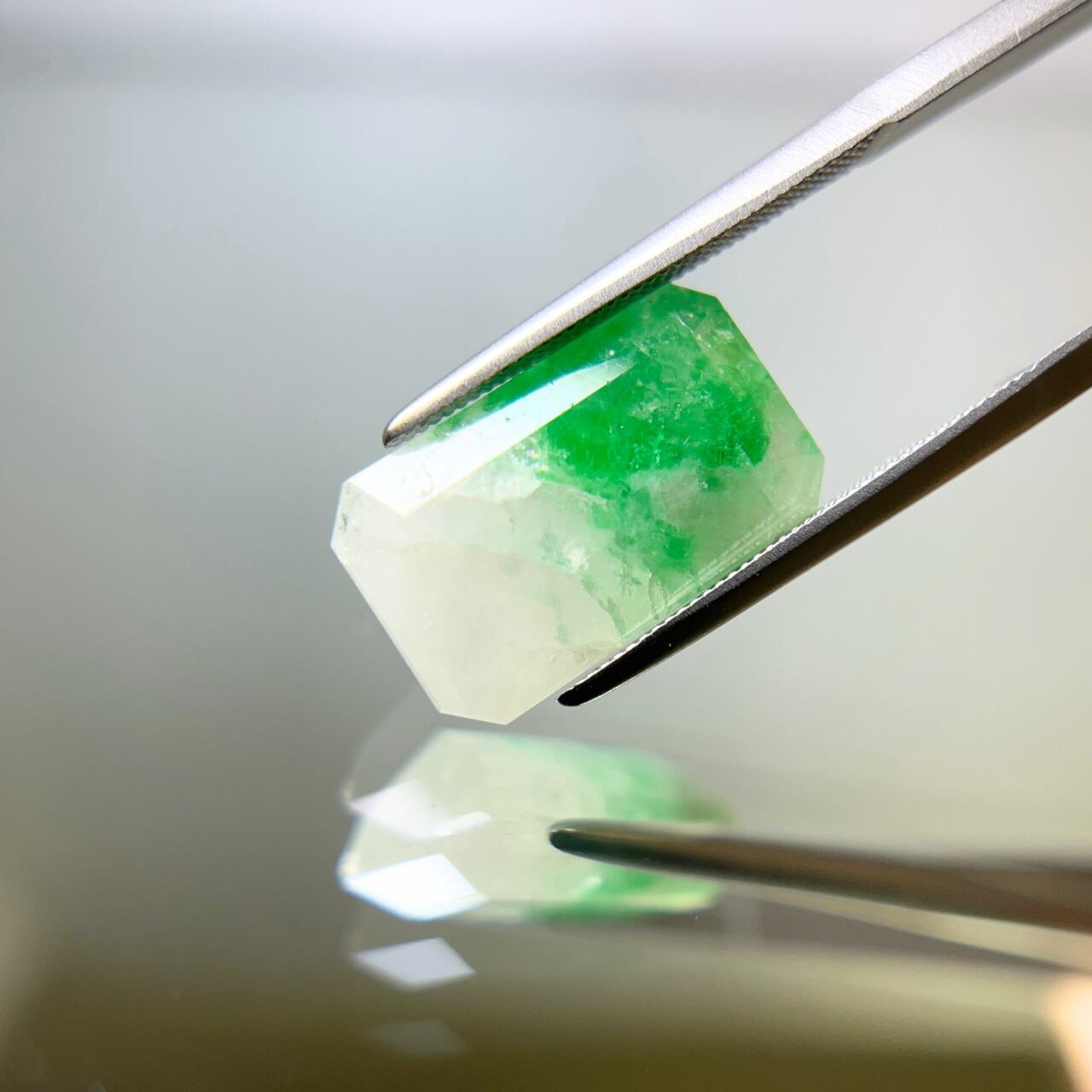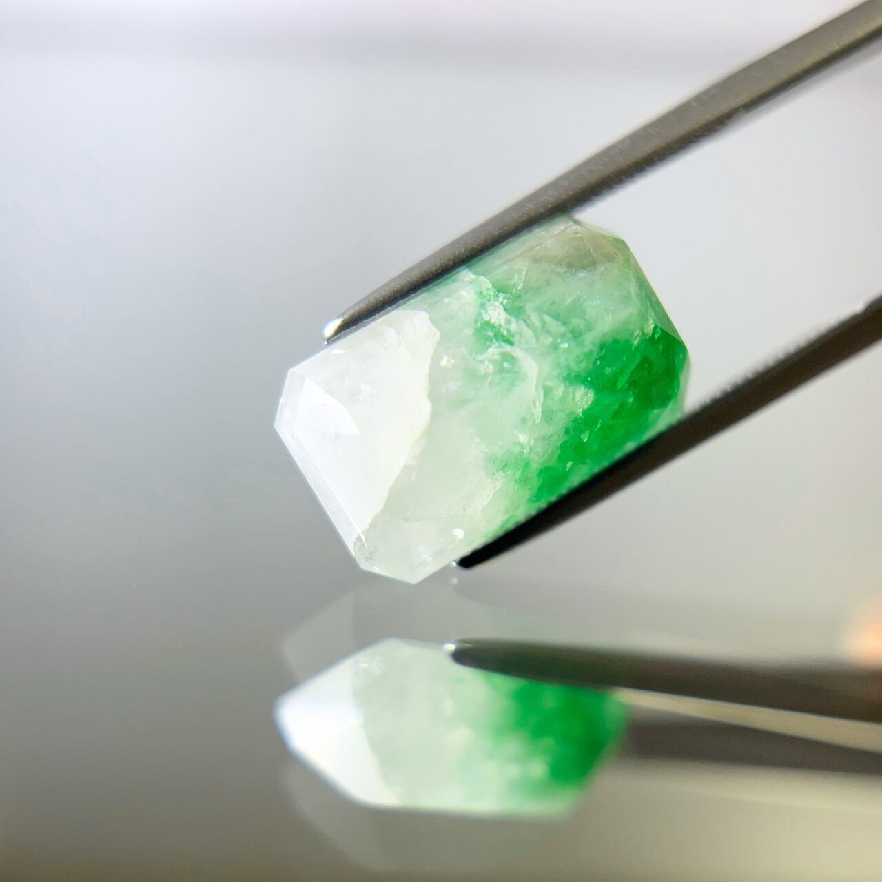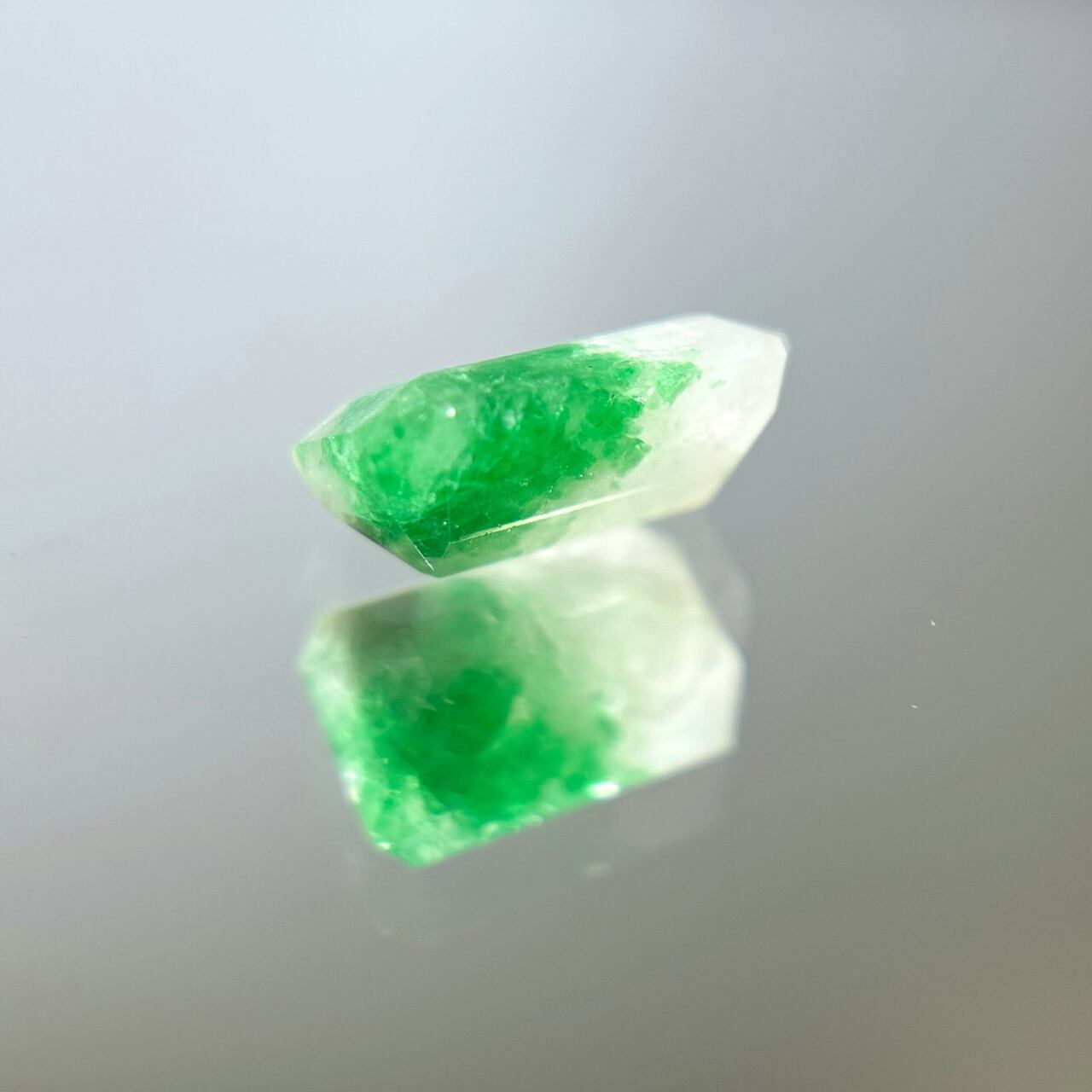 クォーツは乳白色で半透明で"純粋無垢"な印象に対し、エメラルドは、通常黒っぽいインクルージョンが入りやすいのですが、そのような不純物は一切見当たらず、鮮やかなグリーンを発し"爽やか"そのもの…。クォーツの白とエメラルドの緑の対比が、一層お互いの美しさを高め合っており、個人的には『モネの池』を思い出しました。